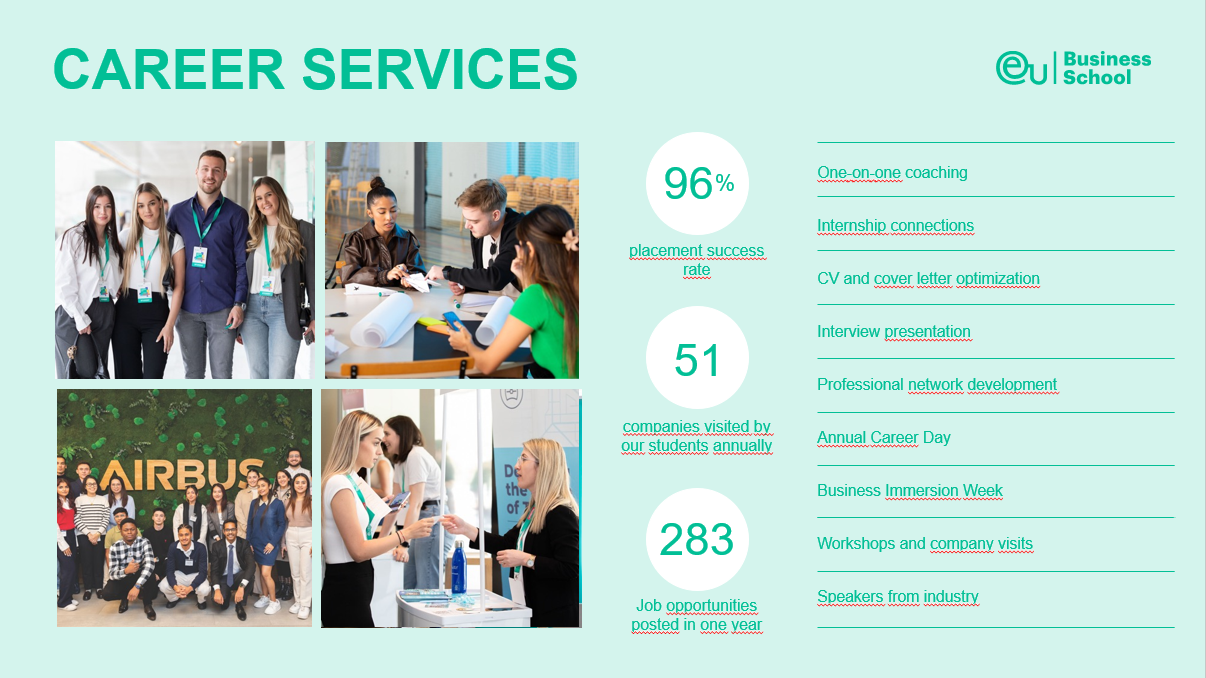 Một trong những điểm mạnh nổi bật của EU Business School là hệ thống hỗ trợ nghề nghiệp chuyên sâu: