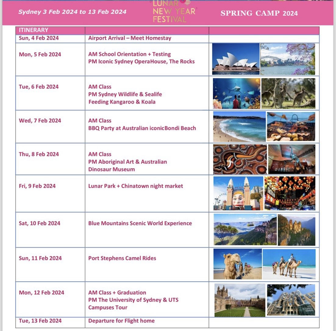 Chương trình các ngày trong tuần có thể tích hợp các chuyến thăm đến bất kỳ trong số hàng trăm điểm tham quan xung quanh Sydney, bao gồm: Nhà hát Opera; Cầu Cảng Sydney; Công viên Luna; Bãi biển Manly; Cảng Darling; Tháp Sydney; Trung tâm dưới nước Ian Thorpe; Sở thú Taronga; Bãi biển Bondi; v.v. Các hoạt động cuối tuần có thể bao gồm các chuyến thăm đến nhiều địa điểm đẹp xung quanh NSW: Blue Mountains; Port Stephens; Thung lũng Hunter; Bờ biển phía nam; Trại lướt sóng cuối tuần; Cuối tuần trượt tuyết; v.v.