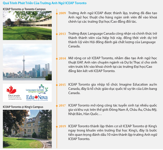 International Centre for English Academic Preparation (ICEAP) Toronto là trường Anh ngữ học thuật tổng hợp nổi tiếng tại Canada. Phương châm chính của trường ICEAP Toronto là cung cấp cho du học sinh nguồn kiến thức Anh ngữ và khả năng ứng dụng đạt chuẩn yêu cầu của các trường Đại học tại Canada, thích ứng với phương pháp học Đại học của Canada, nắm bắt kỹ năng học tập ở bậc Đại học, song song đó thông qua các chương trình chuyển tiếp và dự bị nhằm trang bị cho sinh viên kiến thức học thuật tốt nhất trước khi bước vào chuyên ngành. ICEAP Toronto cũng mang đến nhiều lựa chọn cho du học sinh với các thư mời nhập học thuộc các trường Đại học đối tác. Trong quá trình học tiếng Anh ở Canada, du học sinh sẽ hiểu rõ hơn về các trường Đại học và chuyên ngành học, từ đó đưa ra quyết định sáng suốt trong việc lựa chọn chuyên ngành và trường học thích hợp sau này.