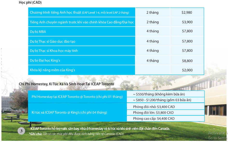 Mục Đích Đào Tạo Của ICEAP Toronto Trường quốc tế Anh ngữ học thuật Canada đóng vai trò trong việc nâng cao toàn diện các kỹ năng nghe nói đọc viết của sinh viên, là chương trình được thiết kế nhằm bồi dưỡng tiếng Anh học thuật cho sinh viên trước khi chính thức bước vào chuyên ngành ở Đại học. Sinh viên sẽ được rèn luyện khả năng Anh ngữ cần thiết cho quá trình học thuật ở bậc Đại học, nội dung bao gồm các kỹ năng xem và thảo luận qua video, kỹ năng nghe, ghi chép, kỹ năng viết và đọc dạng học thuật, kỹ năng tư duy biện chứng, biện luận và thuyết trình, làm quen với các dạng thi cử của Đại học, nâng cao năng lực nghiên cứu và tìm kiếm thông tin ở thư viện. Cấp Độ Đào Tạo Chương trình EAP bao gồm 06 cấp độ, mỗi cấp độ kéo dài 08 tuần. Khi sang đến Canada, sinh viên sẽ được làm bài kiểm tra để xếp lớp phù hợp với năng lực Anh ngữ. Sau khi hoàn tất cấp độ số 06, sinh viên sẽ vào học chương trình chuyển tiếp Cao đẳng/Đại học (02 tháng) hoặc Thạc sĩ (04 tháng) trước khi vào chính khóa. Học phí (CAD)