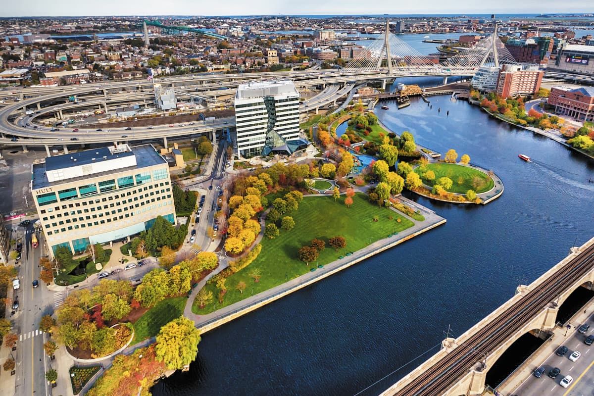 Không chỉ có khuôn viên với tầm nhìn đẹp, trường còn toạ lạc ngay gần bến tàu điện ngầm Boston MBTA. Thành phố còn có dịch vụ xe đạp công cộng cho những ai muồn khám phá thành phố. Khuôn viên trường còn nằm gần Tramj xe lửa phía Bắc, một trong những đầu mối giao thông chính của thành phố và là quê hương của đội bóng rổ nổi tiếng Boston Celtics và đội khúc côn cầu Boston Bruins. Đây cũng là nơi tổ chức nhiều buổi hòa nhạc và các sự kiện đặc biệt khác. Các khu mua sắm và các ngân hàng lớn cũng nằm trong khu vực Cambridgeside Galleria.